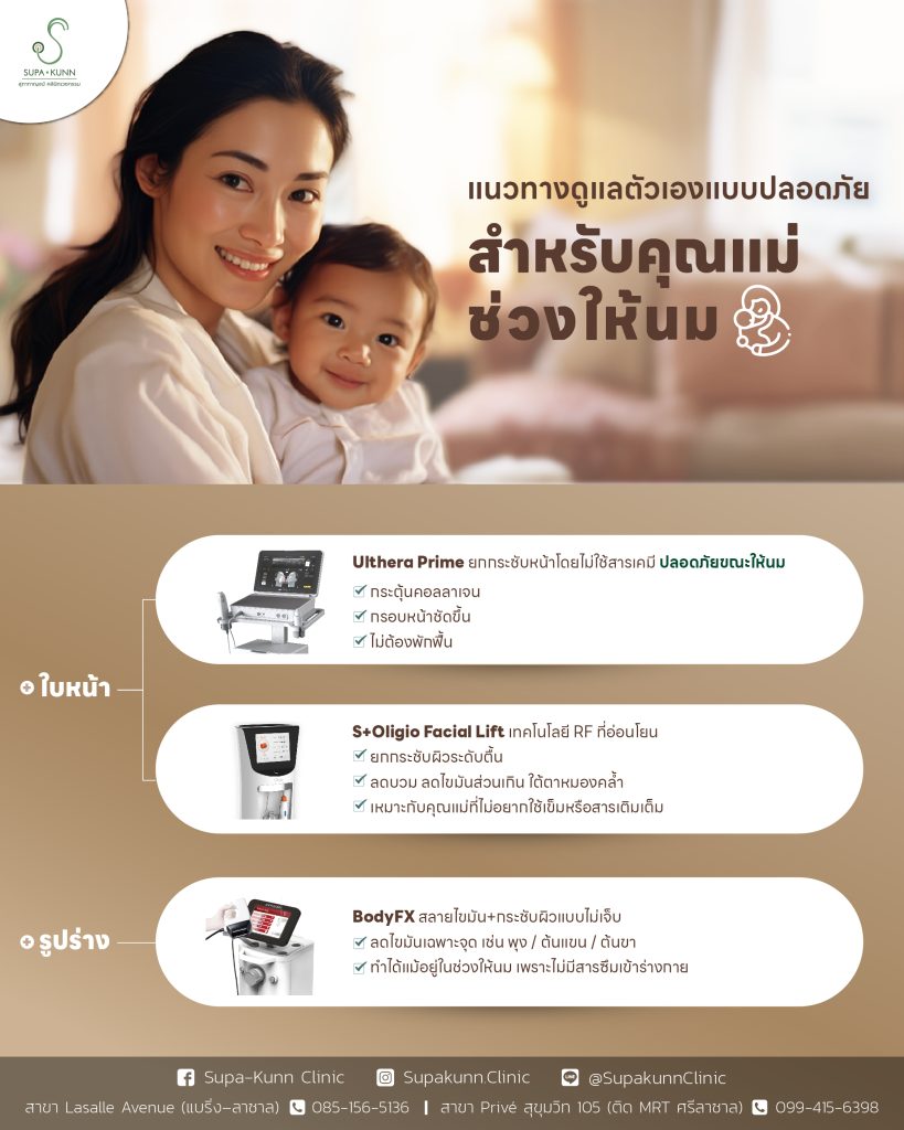 โดยไม่ต้องรู้สึกผิด และไม่กระทบกับเจ้าตัวเล็กเลยวันนี้ SUPA-KUNN Clinic ขอแนะนำแนวทางดูแลผิวและรูปร่างสำหรับ “คุณแม่ทุกช่วงเวลา” แบบปลอดภัย อ่อนโยน และเห็นผลจริง 💚